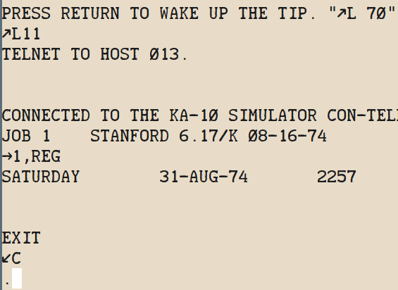 Log in with a TIP (Terminal IMP) to one of the 4 hosts that are currently accessible through VT-05 or clattering Teletype.