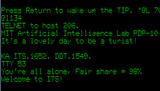 Remember, all this was taken off a tape from 1974! We will have a growing manual page on WAITS soon. But we hope the PiDP-10 Google Group will flood with discoveries made within WAITS. There remains some work to be done, it must be said: the terminal keyboards require careful typing so as not to miss characters; the regular serial terminal multiplexer does not yet work (one serial terminal only) and crucially, the Arpanet NCP code does not yet want to play. We needed a front-end computer (well, Lars Brinkhoff's Linux-NCP) to get Stanford on the recreated Arpanet.