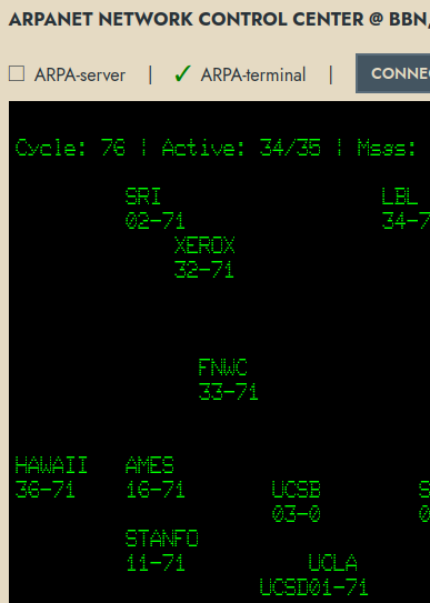 Visit the Arpanet Reconstruction online page, where we are working this into a theme for mainstream museum visitors: "You are at a terminal at the ICCC conference in October 1972, the breakthrough Arpanet event at the time. Relive what people saw and what they could do, and understand why they were so impressed". It is work in progress, but fully functional already. Slight limitation for now: the prototype web interface only allows 8 Arpanet surfers from the internet page at any time. Not the fault of the IMPs!