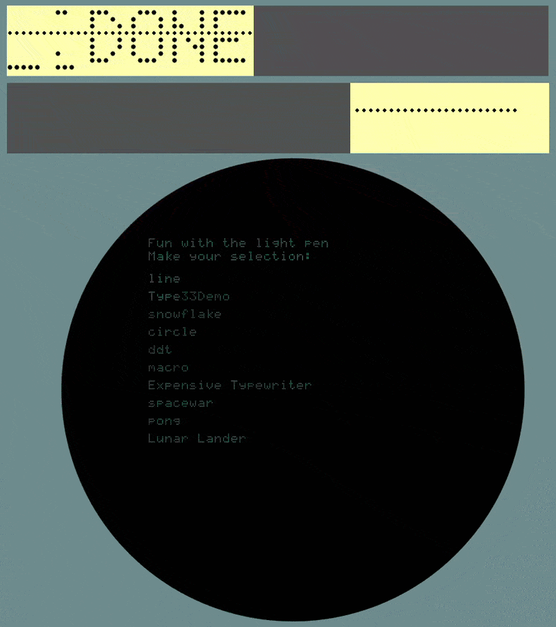 Angelo Papenhoff added a light pen feature as well as the Type 30's character display option to the standard pidp1 software package. So update to get those features. As the rest of the pidp1 simulator, this emulates at the circuit level, so should be extremely compatible with the real machine. He also wrote a new cross-assembler, Monas, that can deal with more than the base 4K words of memory (you can go up all the way to 64KW of course). And a Forth (another beautifully correct historical backport!) is, apologies, Forthcoming.
