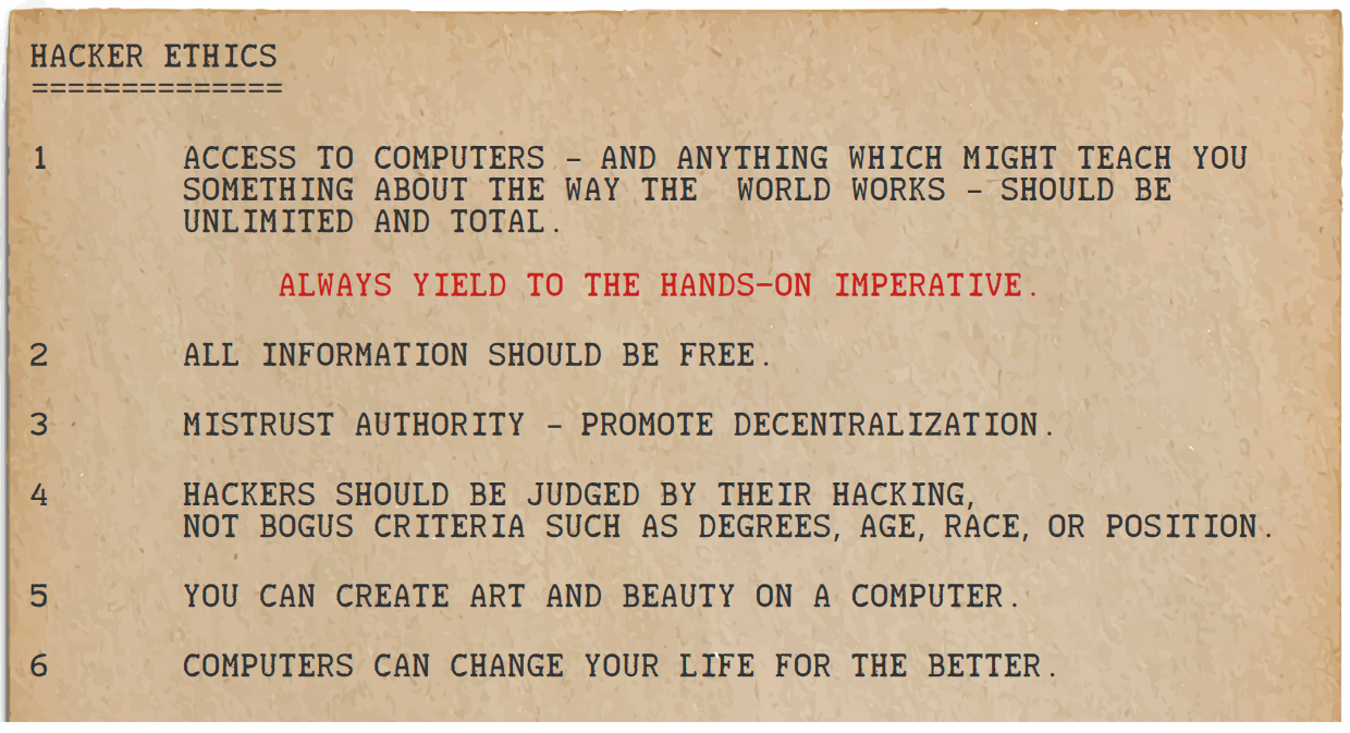 (*) The book Hackers by Stephen Levy (link to the free chapters) is a true must-read if you have not already done so. It gives a very atmospheric background story to the Origin Of Hackerdom.
