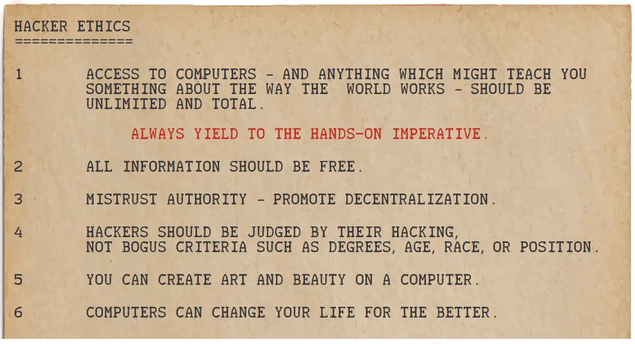 (*) The book Hackers by Stephen Levy (link to the free chapters) is a true must-read if you have not already done so. It gives a very atmospheric background story to the Origin Of Hackerdom.