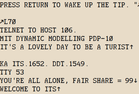 Log in with a TIP (Terminal IMP) to one of the 4 hosts that are currently accessible through VT-05 or clattering Teletype.