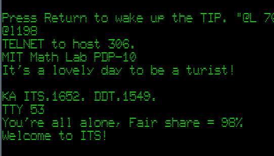 Remember, all this was taken off a tape from 1974! We will have a growing manual page on WAITS soon. But we hope the PiDP-10 Google Group will flood with discoveries made within WAITS. There remains some work to be done, it must be said: the terminal keyboards require careful typing so as not to miss characters; the regular serial terminal multiplexer does not yet work (one serial terminal only) and crucially, the Arpanet NCP code does not yet want to play. We needed a front-end computer (well, Lars Brinkhoff's Linux-NCP) to get Stanford on the recreated Arpanet.