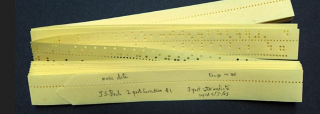 Also notable is the sophisticated transcription of the sheet music - not only pitch and duration of notes were encoded, but also articulation data (staccato) - even ornamentation (trills, mordents, and turns) for his preferred Baroque music pieces. That is, actually, more than is possible with modern Midi! However, there was just one musical instrument to play the four voices: it was always the 1-bit square wave from the bit-banging PDP-1. In other words, it was not a synthesizer. Or not a terribly flexible one :-).