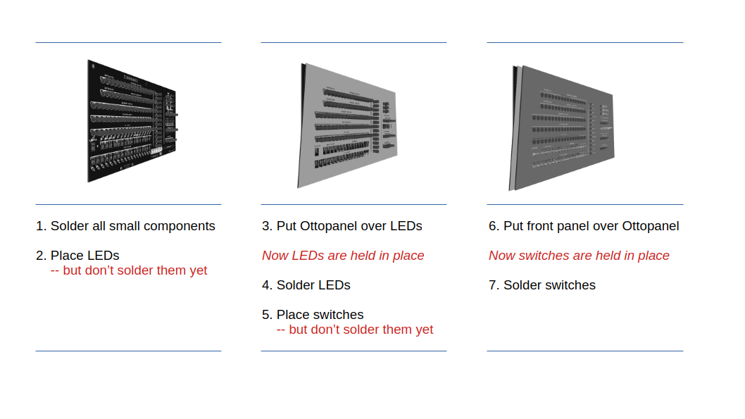 Some builders noted that the panel lamps on the top left are not fully pushed through the front panel. It depends on the tension between the Ottopanel and the PCB. But for some, if they push on the PCB behind it, the LEDs come out more on the top left. Once you see it, you can't unsee it! Annoying.