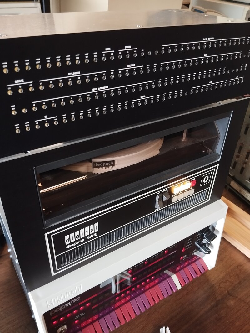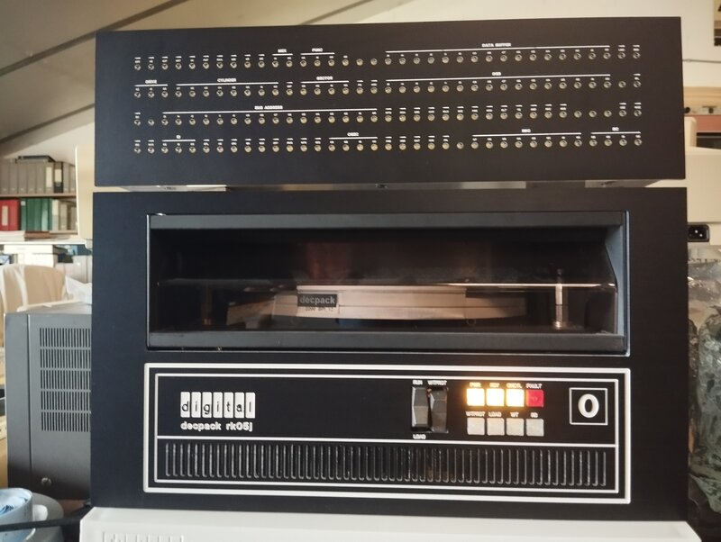 So - imagine the PiDP-11 and RK-05j below are mounted in a replica rack, with (not shown, planned) an added RK05f fixed-disk unit, a half-height blank panel and a RK11-C blinkenlight panel. Topped with a replica Digital PDP-11 masthead panel. That is the "PiDP-11 Rack Extension that we plan to make as a kit.